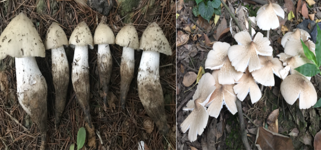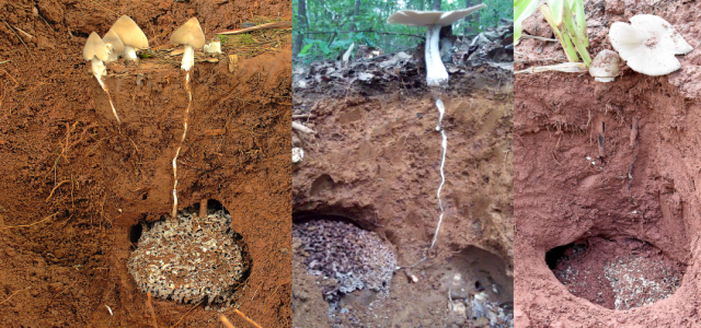 如果白蟻巢體上培養(yǎng)的是雞樅菌的菌絲體,當春天來臨、雷雨過后,蟻巢上方的土壤含水量增大,形成適當的溫差、濕差、氣壓差,巢體上就會形成原基,原基長高形成假根,假根穿過巢體上方的空間,進入巢體上方的土壤,土壤中含水量適宜,假根很快長出土面形成菌柄,菌柄頂端形成菌蓋。雨后空氣濕度大,適合菌柄和菌蓋的生長,在土面上就會突然長出大量雞樅菌的子實體。每年的5月至10月,只要我們不破壞蟻巢,不擾動、驚嚇白蟻,一個蟻巢可以連續(xù)出菇4至5批次。營養(yǎng)豐富的雞樅菌子實體為地面上的昆蟲以及人類提供了美味的食物。在一個很小的干重不到100克的蟻巢體上,就可采集到500克以上的鮮菇,這個出菇行為會大量消耗白蟻所需要的營養(yǎng)物質。
